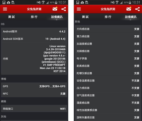 支援加速度計、地磁感應器、近距離感應器、陀螺儀、光源感應器、電子羅盤、A-GPS、NFC 等,但不支援氣壓感應: