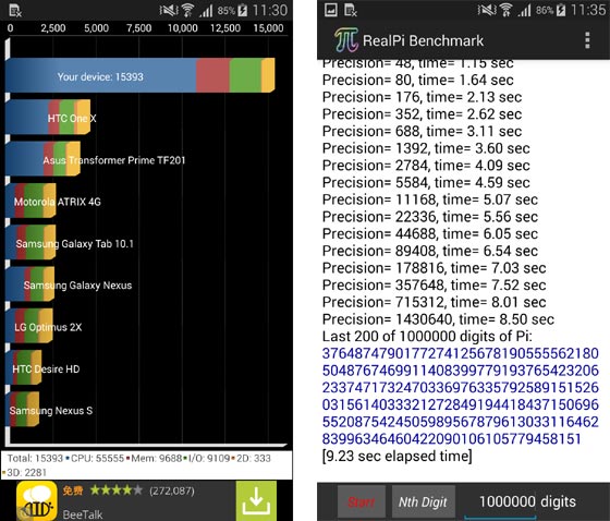Quadrant 跑分則有 15393、用 RealPi 測試計算 100萬位只需 9.23秒: