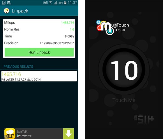Linpack 實測為 1466Mflops。可看到螢幕為 10點觸控: