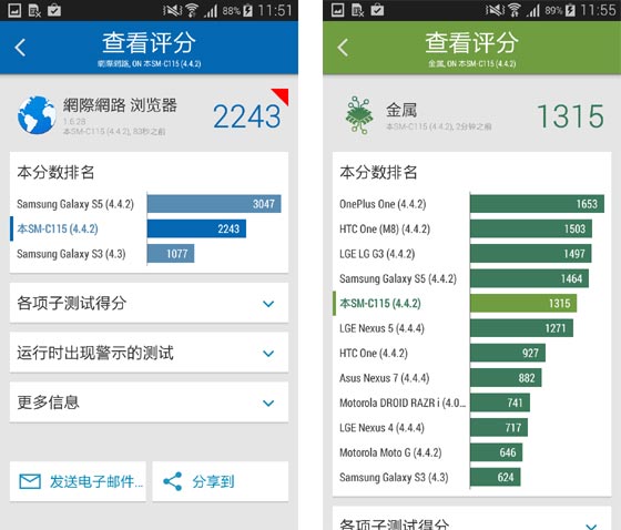 Vellamo 網際網路、金屬跑分分別為 2243, 1315:
