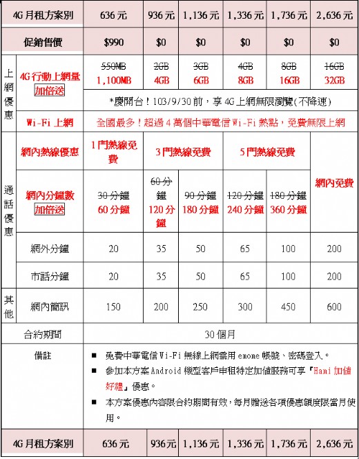 - 適用對象:新申辦(含NP移入)之客戶,及2G/3G符合續約(含無優惠租約)資格之既有客戶