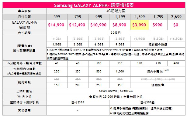 Samsung GALAXY ALPHA鉑型機 - 遠傳電信4G優惠方案