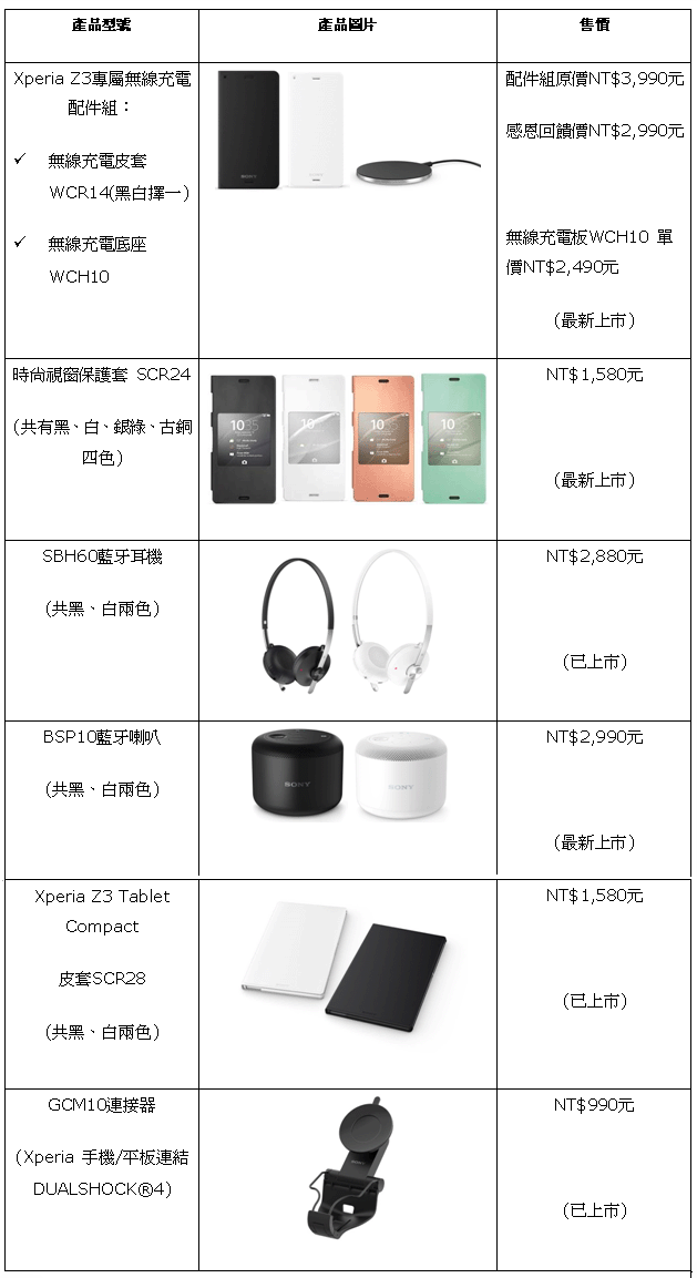 Sony Mobile 旗艦機皇Xperia Z3推出專屬系列完整配件:無線充電皮套WCR14、無線充電底座WCH10、SBH60藍牙耳機及BSP10藍牙喇叭。Sony Mobile推出感恩回饋價,Xperia Z3專屬無線充電皮套WCR14+無線充電底座WCH10配件組,回饋價2990元(原價為3990元)。平板電腦Xperia Z3 Tablet Compact也有推出專屬皮套SCR28,具備桌面支架功能更可立起來看影片,可搭配PS4 Remote Play搖控遊玩,消費者也可選擇搭配GCM10連接器,暢快遊玩PS4遊戲。