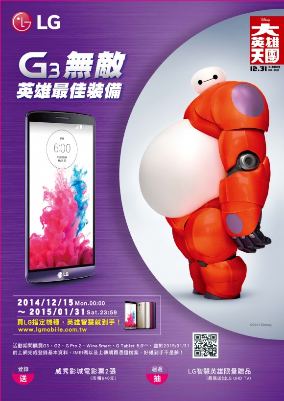 台灣LG電子與迪士尼跨年強檔鉅獻”大英雄天團”合作,推出獨家LG智慧手機天團陣容,讓消費者感受LG智慧手機的強勢超人魅力。LG行動智慧裝置,不僅搭載強悍硬體規格,更擁有人性化直覺操作優勢,在全球屢創銷售佳績,成為消費者最佳行動裝備選擇。歲末迎新之際,LG同步祭出「G3無敵 英雄最佳配備」超值精選好禮回饋活動,讓LG智慧手機成為今年聖誕及2015新年首選熱門商品。凡於活動期間(2014/12/15~2015/01/31)購買LG指定機種,並於2015年1月31日前上活動網站完成登錄及認證,即可獲得威秀電影票兩張,週週抽大英雄天團限量周邊商品、行動電源,更有機會獲得最大獎LG 42型 ULTRA HD TV!