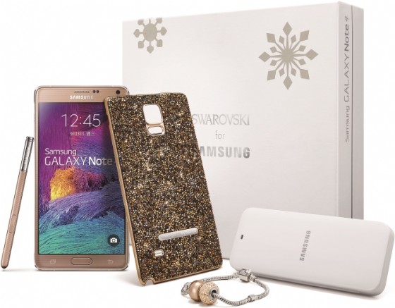 為慶祝GALAXY Note 4不斷締造市場佳績,並適逢耶誕及新年佳節,台灣三星電子今日也宣布即日起至2015年1月15日止,將於三星智慧館限量推出與時尚精品品牌Swarovski施華洛世奇合作的「璀璨精裝版組合」(註三),共有「耀眼銀」、「燦爛金」、「酷黑紫」三種晶耀色系,內含GALAXY Note 4乙支、璀璨晶耀被蓋背蓋乙支(市價$4,990元)、Crystals from Swarovski迷人串珠手鍊乙條(市價$1,499元)及原廠充電組合包(市價$2,190元),整體組合價只要$29,990元!想讓你的閃亮耶誕、炫耀新年成為眾人目光焦點,就靠華麗的水晶點綴GALAXY Note 4的氣宇非凡,也為你的專屬時尚增添無與倫比的光彩!