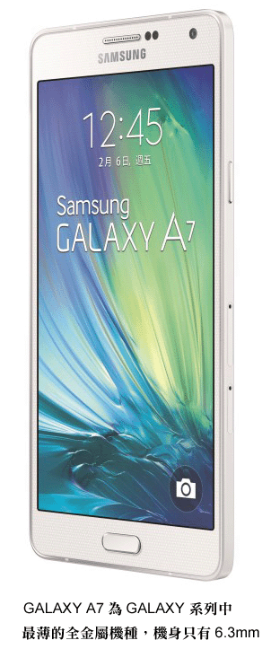 三星電子推出GALAXY A5和GALAXY A3同系列機種GALAXY A7,全金屬一體成型質感、更加輕薄的6.3mm機身設計除了搭載自拍功能,並採用5.5吋Full HD sAMOLED 顯示螢幕,且GALAXY A7可支援4G雙模雙待。