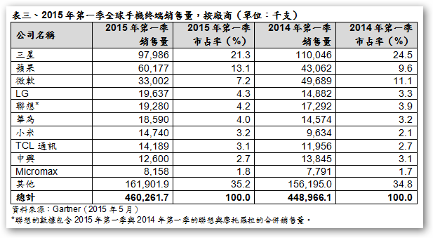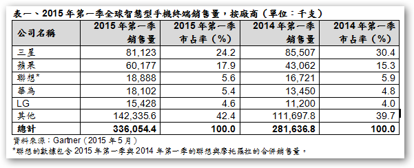 Gartner 2015年Q1 全球智慧型手機市場成長 19.3%