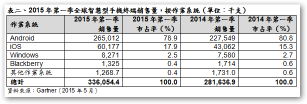 在智慧型手機作業系統(OS)市場,Android的市占率減少1.9個百分點,而iOS則是連續第三季較前一年成長(參見表二)。Gartner研究總監Roberta Cozza表示:「iPhone於2015年第一季在中國的強勁銷售已對Android在該國的表現造成衝擊。Android在中國的銷售量首次較前一年下跌4%。Windows Phone的表現依然平平,主要是生態體系沒有起色,手機品牌也不吸引人,再加上智慧型手機市場已有強大且具優勢的競爭對手。即將推出的Windows 10可在各種不同裝置之間提供一致的使用者體驗,但開發人員是否買單尚待觀察。」