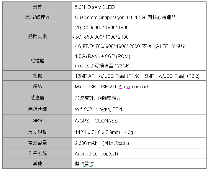 Galaxy J5具備2,600mAh可拆式電池,此外更支援超省電模式,可關閉不必要的功能,並將螢幕轉為黑白以節省電力,延長裝置的電池使用時間。Galaxy J5也支援4G雙卡雙待功能,搭配4G+2G+Micro SIM的便利三卡槽設計,軟硬體方面,支援最新Android 5.1作業系統、LTE Cat.4網路、搭配四核心處理器,以及最大可擴增128GB外接記憶卡。