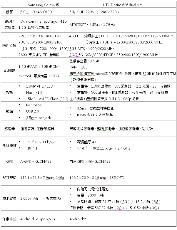 Samsung和HTC搶攻小資族市場,各自推出5吋4G 雙卡智慧手機 Samsung Galaxy J5 與 HTC Desire 626 dual SIM,且價格均為5,990元,主相機及前相機畫素也分別為1300萬及500萬畫素,詳細規格表比較如下: