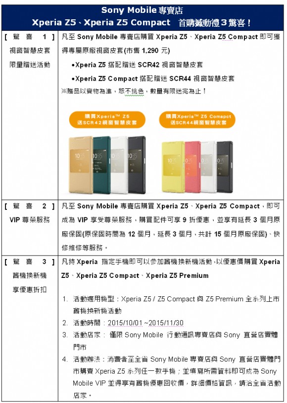 Sony Mobile專賣店推出「首購撼動禮 3驚喜」,購買Xperia Z5或Xperia Z5 Compact即可獲得智慧視窗皮套一只(市售1,290元)+ VIP尊榮服務+舊換新優惠折扣。此次Sony Mobile更與中華電信、台灣大哥大、遠傳電信、台灣之星合作,同步於10月1日展開推出優惠資費方案。