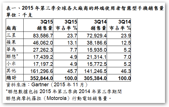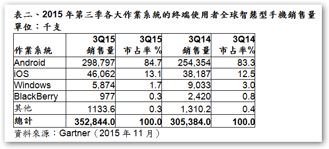 國際研究暨顧問機構Gartner表示,新興市場持續對於中低價智慧型手機的需求,帶動了2015年第三季全球智慧型手機銷售量。全球終端使用者智慧型手機銷售量達3億5,300萬台,相較2014年同期成長了15.5個百分點(見表一)。
