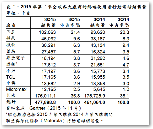 2015年第三季期間,全球終端使用者手機總銷售量近四億七千八百萬台,相較2014年同期成長了3.7%(見表三)。新興市場的持續成長為本土品牌撐腰,讓Micromax躋身全球前十大手機商,而中國廠商像是中興(ZTE)、華為(Huawei)、小米、TCL、OPPO與步步高電子(BBK)在新興市場也變得日漸積極。