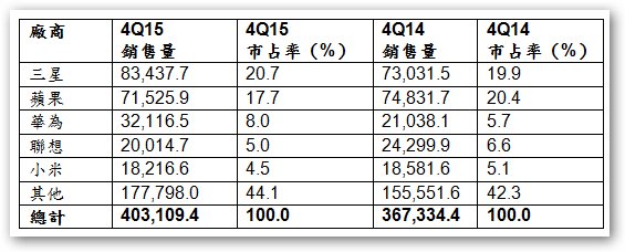表一、2015年第四季全球各大廠商的終端使用者智慧型手機銷售量(單位:千支)