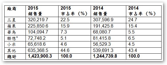 表二、2015年全球各大廠商的終端使用者智慧型手機銷售量(單位:千支)