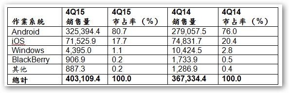 在智慧型手機作業系統市場,Android裝置單位數量於2015年第四季成長了16.6%,占全球市場的80.7%(參見表三)。Gartner研究總監Roberta Cozza表示:「Android受益於中低價智慧型手機的持續性需求,以及iOS在2015年第四季於高階市場的成長趨緩。」在高階市場方面,雖然蘋果第四季銷售量的年成長率趨緩,蘋果在2015年仍減少了其與三星市占率之間的差距。