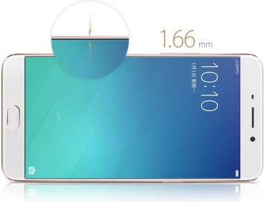 OPPO R9外觀設計繼承了前代的金屬特性,但更為輕薄。它尺寸為151.8x74.3x6.6mm,重量則僅有145g。由於1.66mm的極窄邊框設計,OPPO R9得以在5.2吋手機尺寸裡容下了5.5吋的手機螢幕。