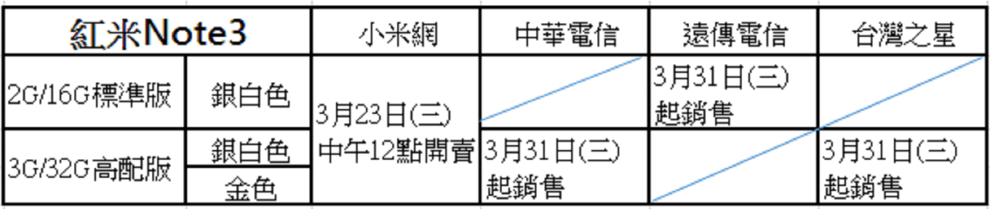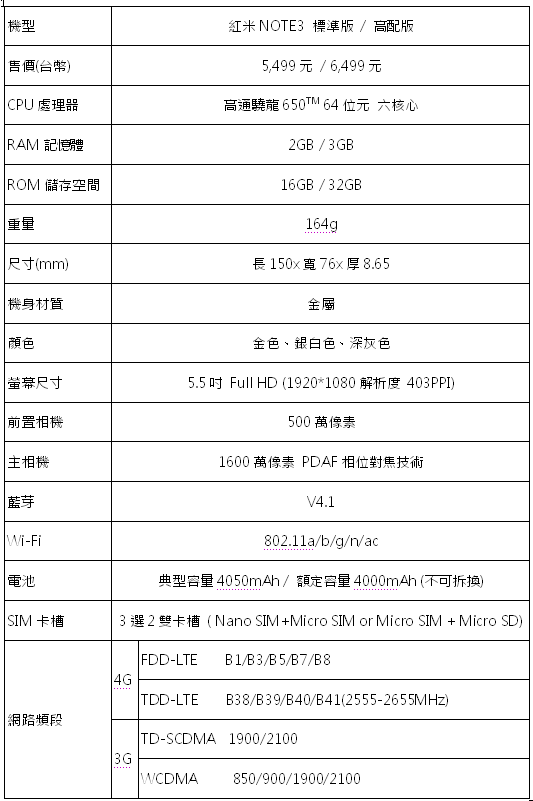 紅米Note3在台灣上市的機型中有二個版本三個顏色,2G /16G標準版 售價5499元、3G/32G高配版 售價6499。各版本顏色開賣細節分別如下: