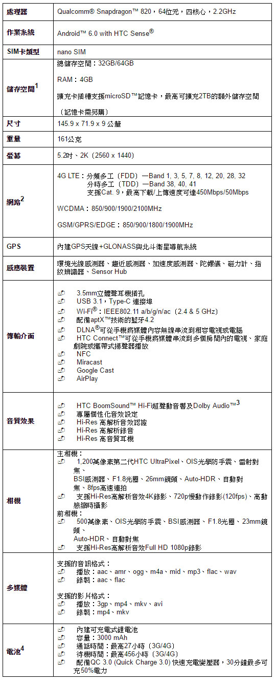 1. 為滿足全球多元市場需求,HTC 10將推出兩款搭載不同Qualcomm Snapdragon處理器的版本,提供相同設計、音響、相機、顯示與相似的軟體體驗及電池續航力。