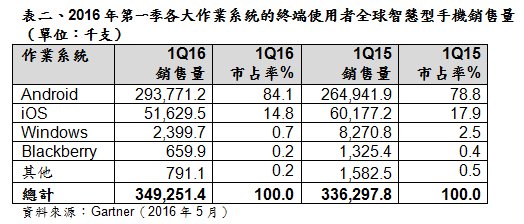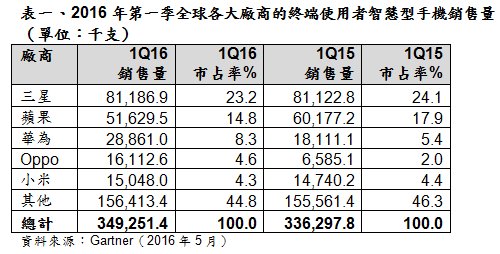 2016年第一季全球終端使用者智慧型手機銷售量達3.49億支,較2015年同期成長3.9%(見表一)。智慧型手機銷售量占2016年第一季所有手機銷售量的78%。