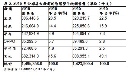 就2016年全年來看,智慧型手機銷售量總計15億支,較2015年增加5%(見表2)。