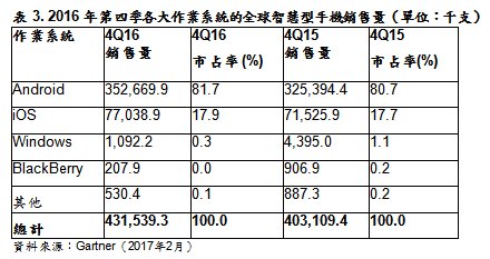 在智慧型手機作業系統市場方面,Google的Android系統擴大領先幅度,2016年第四季整體市占達82%(見表3)。就2016年全年來看,Android市占也成長3.2個百分點,達84.8%,而且是各作業系統中唯一市占率較前一年上揚者。Anshul Gupta指出:「Google推出Pixel手機後,頂級Android智慧型手機更具競爭力,而(諾基亞的)HMD手機重返基本款(中階)智慧型手機領域,則將近一步提升該款作業系統在新興市場的競爭力。」