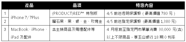 德誼數位Data Express今日(22) 宣布,蘋果最新推出的iPhone 7/ 7 Plus (PRODUCT)RED 特別版、升級版iPhone SE 即日起開放預購,4月5日前凡至德誼數位任一門市購買(PRODUCT) REDTM即送「透明」保護殼,購買其他顏色iPhone 7/7 Plus也同享優惠,買就送最高單價1,380元指定款保護殼。此外,4月30日前至全台指定15家德誼數位門市,使用玉山銀行信用卡付款,單筆消費30,000(含)元以上立享18期0利率。