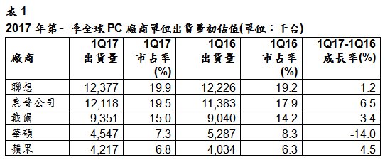 Gartner: 2017Q1 PC市場較去年下滑2.4%