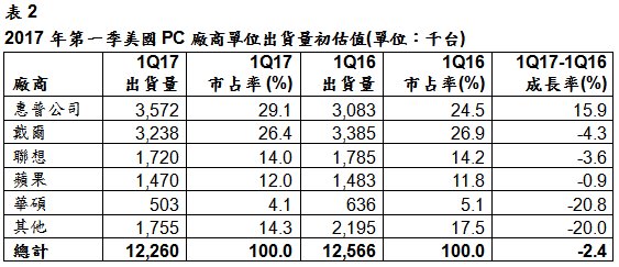 2017年第一季,美國地區PC出貨量總計1,230萬台,較去年同期下滑2.4%。美國市場已連續兩季微幅下滑,主要原因歸咎於消費性市場疲弱。