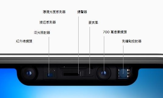 Face ID 功能不只是靠前鏡頭的拍攝能力,而且還透過了許多輔助裝置,才能達成各種環境光源下的正確辨識率,其中除了 7MP 前鏡頭外,還包括了紅外線鏡頭、泛光照射器、點繪測透射器,投射並分析超過 30,000 個不可見光測繪點,製作精準的面孔深度測繪圖,藉以當成個人獨一無二的臉孔密碼,並儲存為 A11 Bionic 晶片內由 Secure Enclave 所保護的資訊。
