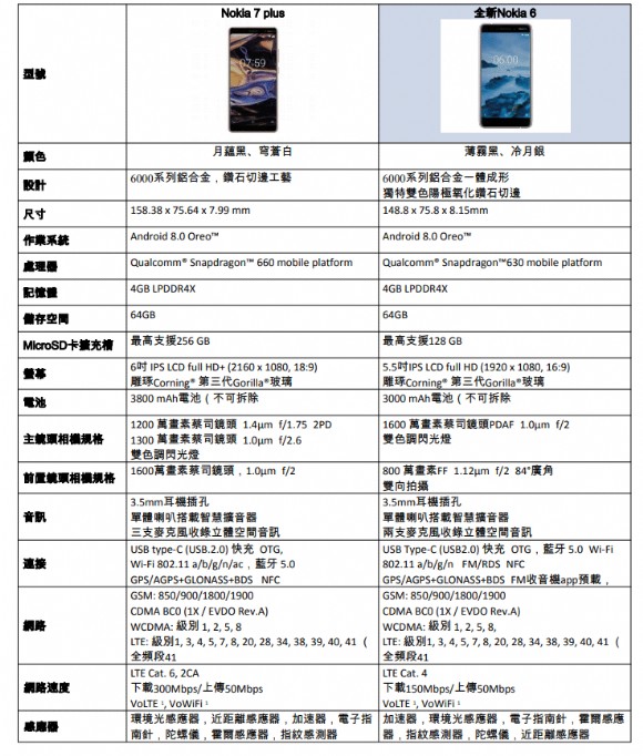 Nokia 7 plus與全新Nokia 6規格表