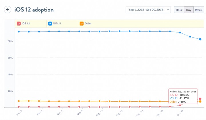 市調公司 Mixpanel 發佈資料指出,iOS 12 發佈後經過 48小時,據他們統計更新的 iPhone 用戶只有 10%左右。這個數字看起來比以往的 iOS 11、iOS 10 還差。