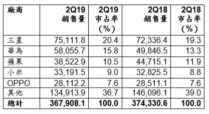 表1、2019年第二季全球智慧型手機廠商銷售量(單位:千支)
