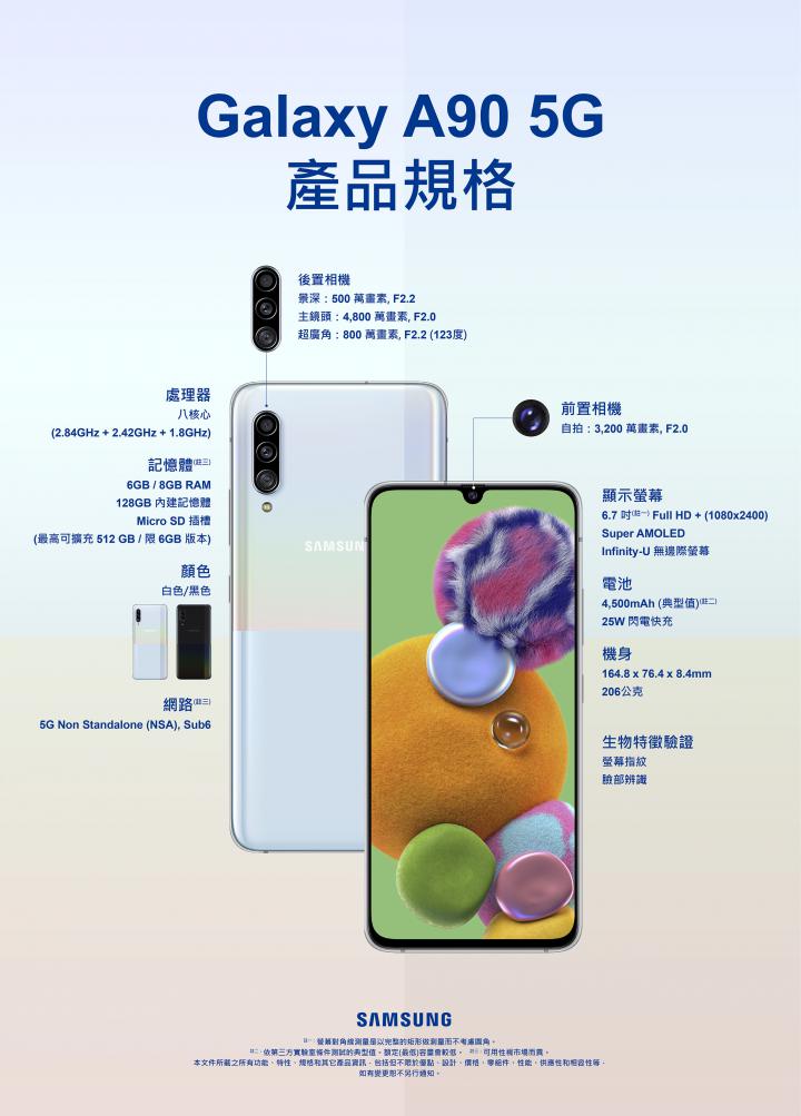 Galaxy A90 5G機背玻璃採用獨特的幾何圖案設計,共推出黑與白兩款經典顏色供選購,將於9月4 日起在韓國開賣,並將陸續在全球各地上市。