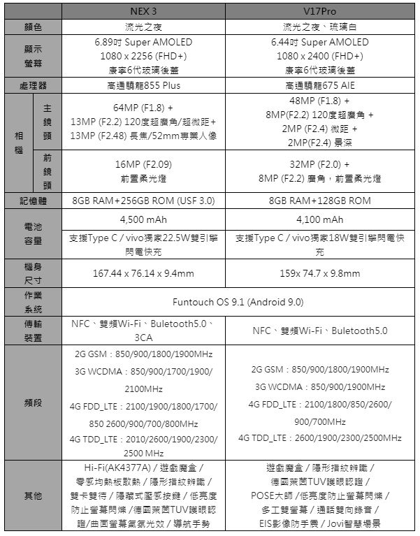 vivo 繼陸續推出首款採用螢幕下隱形指紋解鎖技術、全螢幕發聲技術和升降式前置鏡頭手機,引領市場潮流後,在台發表NEX 3及V17 Pro兩款新機再掀話題。NEX 3採絕美無界瀑布螢幕,搭配隱藏式壓感按鍵,螢幕佔比高達99.6%,網路使用則可支援5G;世界首創前置升降雙鏡頭、全台首款六鏡頭V17 Pro,則針對以社群生活為重、熱愛拍照的年輕族群設計,輕鬆一機捕捉超廣角、超級夜景與微距等情景,完美滿足手機原生世代熱愛以影像記錄生活的美拍需求。
