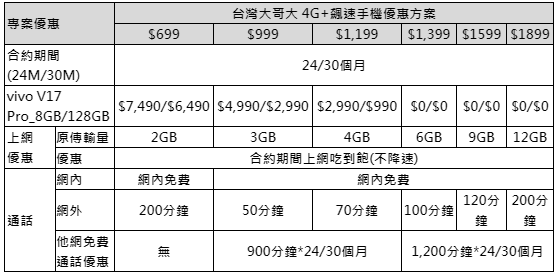 V17 Pro將於11/1在台灣大哥大全省直營暨特約門市和指定通路開賣,共有「流光之夜」與「琉璃白」兩色,售價12,990元,搭配台灣大哥大指定專案,月繳999元、綁約30個月手機2,990元, 12/31前購買vivo V17 Pro,並登錄再抽市價52,900元SHARP 4K 70吋液晶電視。