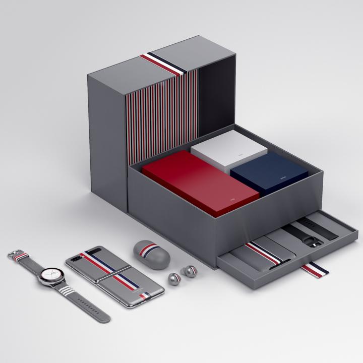 Galaxy Z Flip Thom Browne聯名款鎖定勇於表達自我主張,且渴望其所使用的科技產品,能如同其穿搭一般具有指標性的族群。Galaxy Z Flip限定配色-礫石灰,復刻Thom Browne在伸展台上的經典不敗色系,同時亦保留所有Galaxy Z Flip的創新特色。而為了讓整體外型更臻完美,該特別版本亦隨盒附贈客製設計的Galaxy Buds+和Galaxy Watch Active2。