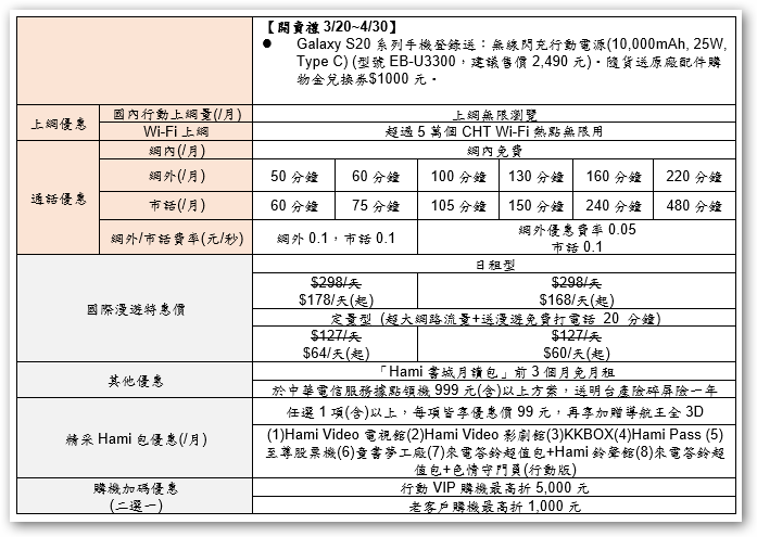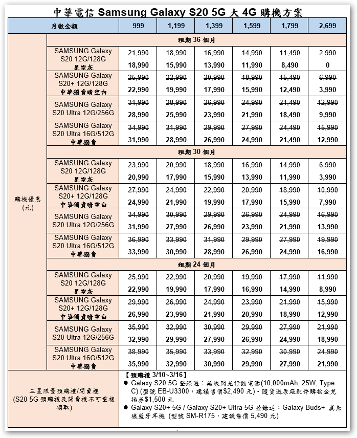 中華電信同時宣布購機優惠方案,申辦「大4G方案月繳999元(含)以上,享行動上網吃到飽、最大網內免費講,Samsung Galaxy S20 5G全系列機型享限時購機折價3,000元」。預購Galaxy S20 5G加贈原廠無線閃充行動電源及配件購物金1,500元;Galaxy S20+ / S20 Ultra 5G 限量預購禮Galaxy Buds+真無線藍牙耳機(原價5,490元);另行動VIP客戶可再享最高折扣5,000元,即刻享購機折價最高8,000元的驚喜購機優惠方案。