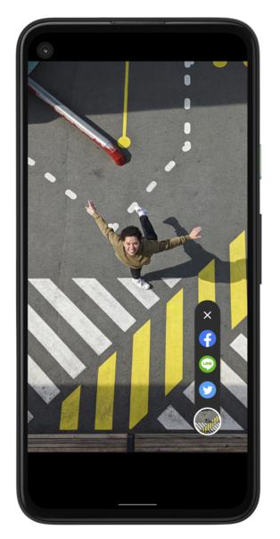 Pixel 4a 擁有與 Pixel 4 同樣令人驚艷的相機體驗,並採用全新的挖孔式前置鏡頭設計,Pixel 4a 延續的 Pixel 4 各項相機功能,已幫助數百萬名 Pixel 使用者拍出精彩相片。包括 HDR+ 和雙重曝光控制、肖像模式、絕佳鏡頭、夜視、天文攝影5功能,以及融合式影像穩定器,而「社交分享」功能,讓使用者在拍攝完成後,可以一鍵點選直接與好友分享相片。