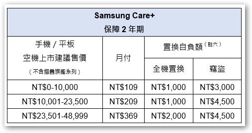三星行動裝置保險Samsung Care+提供消費者全方位守護,凡於全台三星智慧館購買指定智慧型手機或平板,即可現場加購Samsung Care+,最低月繳NT$109起,保障二年期,涵蓋竊盜、意外損害、延長保固,每年理賠上限3次(註五),提供完整產品保障;未來亦將持續傾聽消費者需求,研擬多元的投保方案,持續帶給消費者更加便利、貼心的服務。
