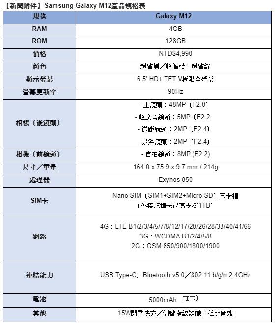註一:Galaxy M12線上指定通路:三星商城、PChome 24h購物、MOMO購物網、Yahoo!購物中心、蝦皮商城三星旗艦館、ETmall東森購物、LINE口袋商店。產品實際到貨時間、販售顏色,以及各項方案,依各通路公告為準。