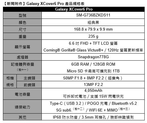 註二:產品資訊請參閱官網:https://www.samsung.com/tw/business/smartphones/xcover/galaxy-xcover6-pro-sm-g736bzkds11/(購買頁面預計於7月11日12:00後開啟)。產品到貨時間依各通路公告為準。