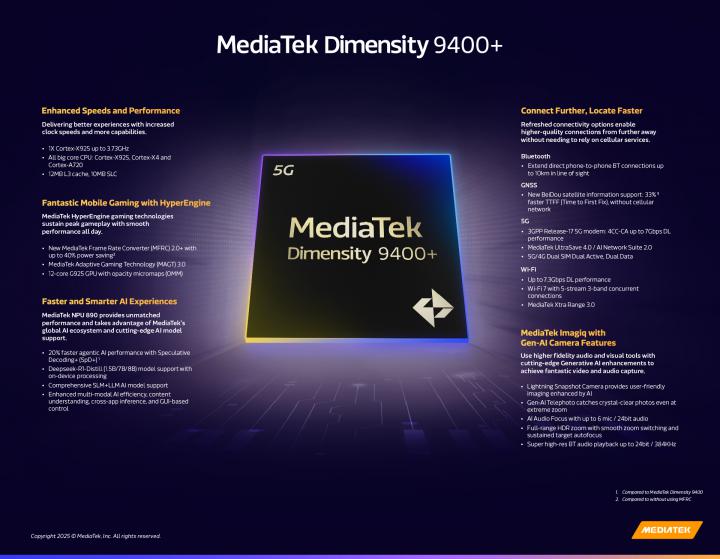 聯發科技發表天璣9400+ 5G旗艦晶片。作為天璣旗艦系列最新晶片,天璣9400+在超高能效與效能提升的設計之下,提供卓越的生成式AI與Agentic AI能力,並支援最新大型語言模型(LLM)。天璣9400+採用全大核CPU設計架構,包含1個最高頻率可達3.73GHz的Arm Cortex-X925處理器,以及3個Cortex-X4、4個Cortex-A720核心。天璣9400+強大的配置,大幅提升單線程和多線程效能,為Android裝置使用者提供頂級的體驗。