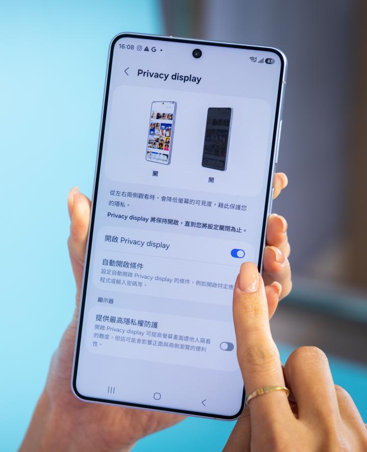 使用者可自訂智慧防窺的啟用時機,例如輸入PIN碼、圖形、密碼或開啟特定應用程式時,並可根據情境調整隱私等級。局部防窺可智慧限制彈出式視窗通知的可視性,而提供最高隱私防護能進一步遮蔽側面視角,提升隱私,且幾乎不影響電量或操作體驗。