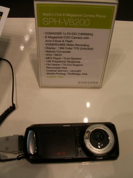 Samsung 日前發表一款全世界第一部八百萬畫素的照相手機: V8200。但 V8200 儼然就是一部數位相機,除了搭載了八百萬畫素的 CCD 感光元件外,也能錄製 640x480 動態影片。