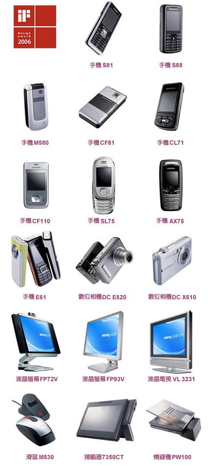 BenQ 2006年一共榮獲十七項iF設計大獎,其中,手機得獎產品高達九項,得獎名單包括BenQ-Siemens手機S81、CF81、M580、S88、E61、CL71、CF110、SL75及AX75,DC E520、DC X610數位相機,FP72V、FP93V液晶顯示器,VL3231液晶電視,PW100可攜式光碟燒錄機、7350CT掃描器,以及M530無線滑鼠。