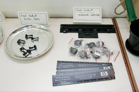 江惠櫻進一步指出:「由於碳粉匣、墨水匣為特殊回收品,一顆墨水匣中就包含了殘餘的少量墨水、金屬晶片及塑膠外殼等三種可回收資源,所以如果將廢棄墨水匣以單純塑膠類回收,反而容易造成污染!目前台灣還沒有能夠妥善處理廢棄耗材分類的設備,所以HP的作法是將回收之廢棄耗材送至澳洲進行資源回收材料的分類及再製。殘餘墨水再製成為大樓外牆之粉刷顏料,塑膠外殼則經過振碎、高壓再製為礦坑內的支撐木、公園椅、汽車保險桿及HP印表機、掃描器的內部零件!透過高科技設備,讓廢棄耗材完全不進入掩埋場,重新成為生活中的實用物品,落實『廢棄資源再利用』的環保概念!」