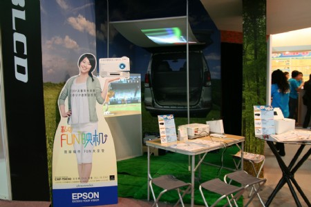 Epson本月初推出新一代擁有音響、DVD播放器、與投影機三機一體特色的 “私のFUN映机”家用投影機–EMP-TWD10/EMP-DM1,分別加入業界首款180度旋轉投影以及天花板投影等功能,讓消費者空間運用更具彈性。在資訊月期間,消費者凡購買EMP-TWD10/EMP-DM1便可獲得巿價NT$8,000元的80吋氣壓式布幕,而購買EMP-DM1的消費者更可獲贈市價NT$7,000的燈泡兌換券。此外,配備全球頂級Full HD 1080P家庭劇院投影機EMP-TW1000,也提供優惠價格給現場體驗的民眾。