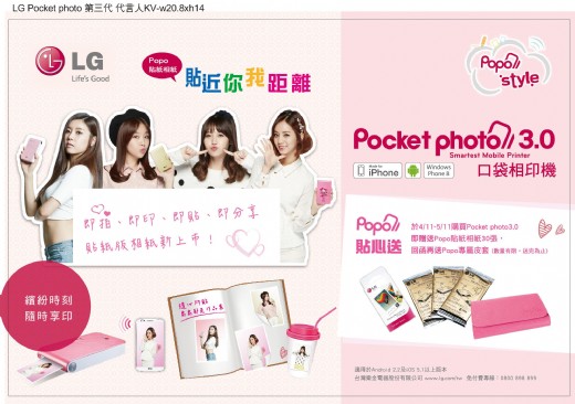 LG Pocket photo自推出以來,已於全台颳起隨拍即印的風潮,簡易便利的操作加上編輯分享的樂趣,受到廣大消費者的喜愛,甫於1月上市的新一代Pocket photo 3.0口袋相印機,外型不只更纖薄輕巧,還有甜心粉、優雅白、淘氣黃三種顏色選擇,無論在編輯軟體或是畫質上都有提升;現在,LG更隆重推出全新貼紙款相紙,除了「即編」、「即印」、「即分享」之外,又新增「即貼」樂趣,LG歡慶全新貼紙款相紙玩樂上市,凡於4月11日至5月11日期間購買LG Pocket photo 3.0口袋相印機指定機型,就送貼紙款相紙乙盒,回函再送限量「LG Pocket photo 3.0口袋相印機專屬Popo皮套」乙個,趕快擁有就能隨時與親朋好友分享繽紛生活與精采回憶。