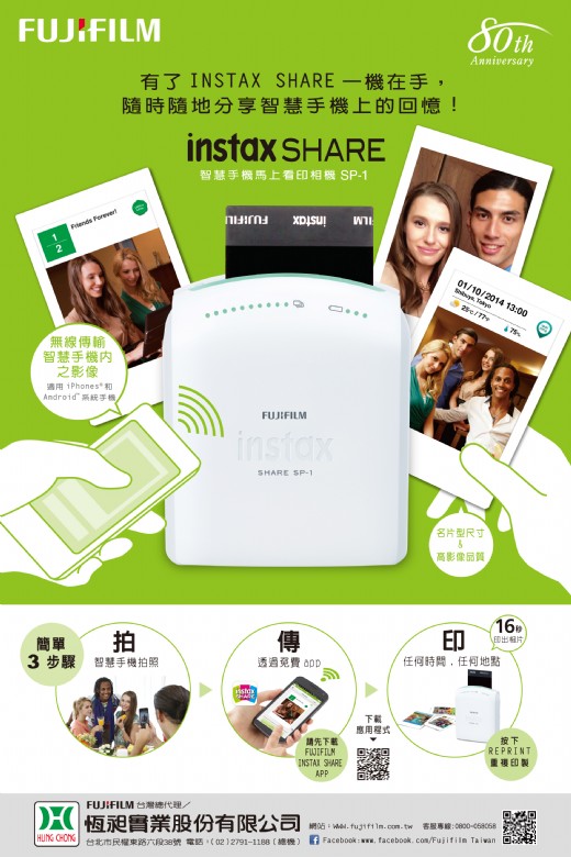 喜愛拍照、熱愛拍照的你,所拍攝下來的影像是否都冷冰冰的躺在手機、儲存碟或雲端裡?有多久沒有被所拍的影像印成栩栩如生、色彩繽紛亮麗的相片所感動?所印出的相片竟能擁有如紀念鈔般的限定唯一感?擁有專利APP及多種版型花邊的「富士智慧手機馬上看印相機SP-1」,可利用智慧手機(或平板)內的影像無線傳輸,隨時隨地只要16秒即可印出相片自賞或分享,在世界各地廣泛受到年輕族群的青睞!恒昶實業公司表示,即日起亦將開始販售「富士智慧手機馬上看印相機SP-1」, 讓台灣愛好拍照的朋友又多了一番新樂趣!